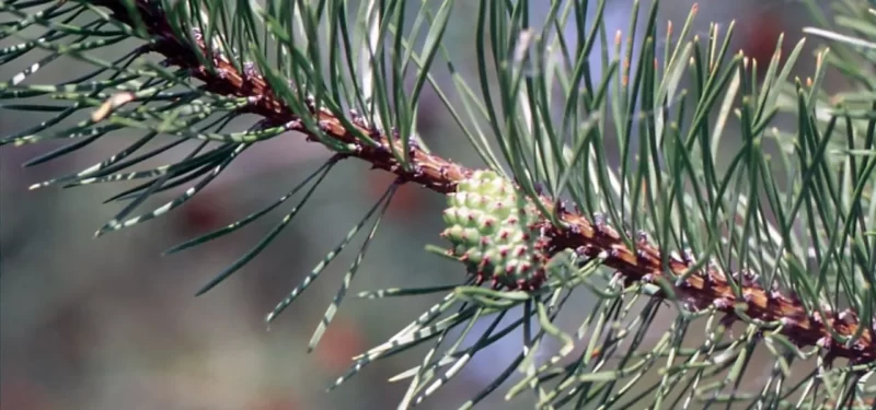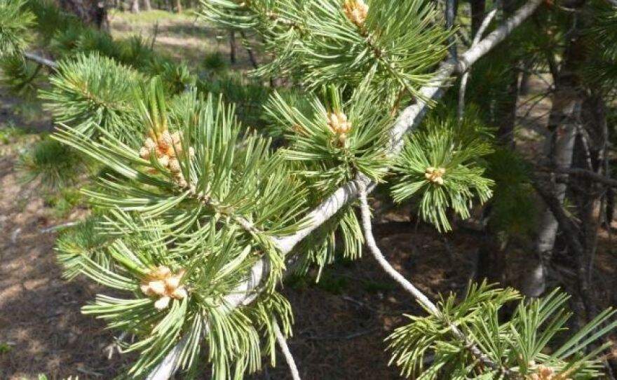 The limber pine is a medium to large-sized pine, growing up to 80 feet tall. It has a slender trunk and long needles that are blue-green in color. The needles grow in pairs and they are up to 3 inches in length.